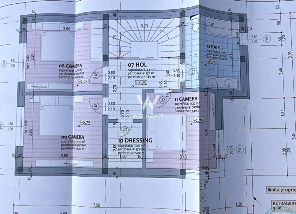 La etaj - hol, 3dormitoare, baie mare, dressing
