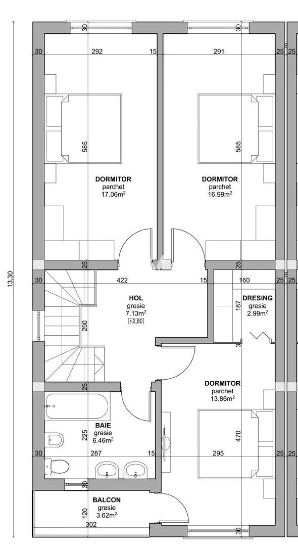 La etaj: 2 dormitoare de 17 mp, hol, baie si 1 dormitor cu dressing si balcon