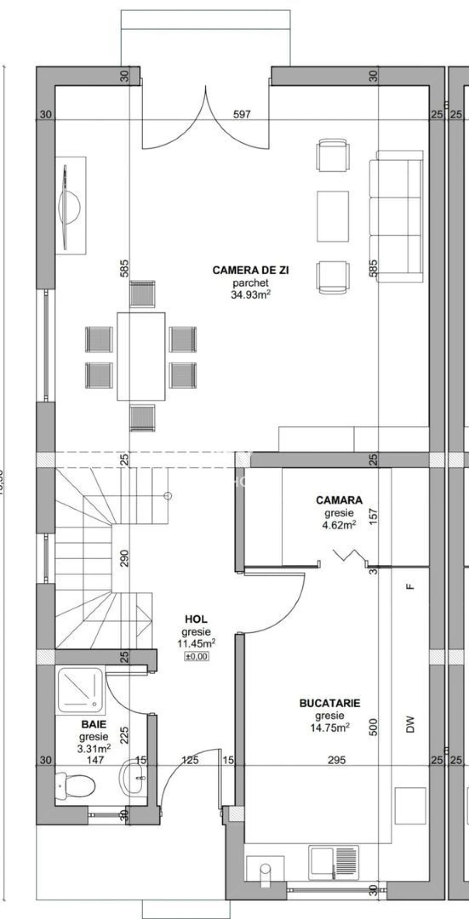 La parter: hol cu spatiu garderoba, baie, bucatarie mare, depozitare si living generos