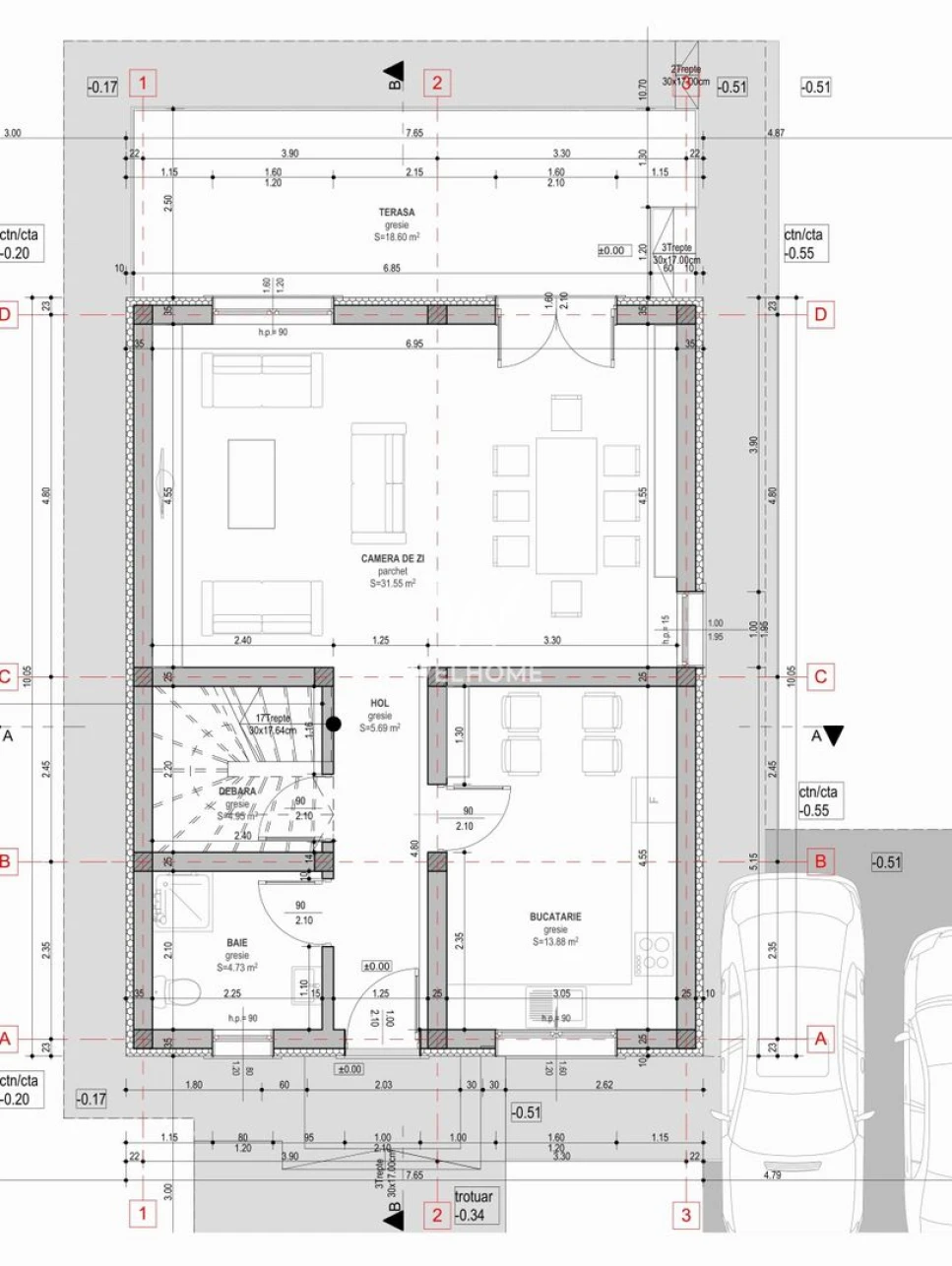 La parter: hol larg de acces, living mare, bucatarie seprata, debara si baie. Living cu acces in terasa - spatiu ideal pentru familie