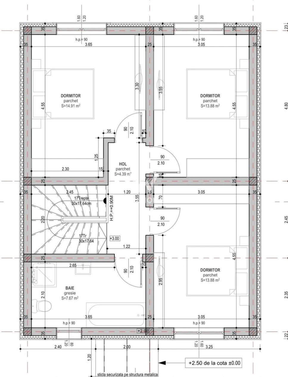 Etaj: 3 dormitoare permisive, hol si o baie mare