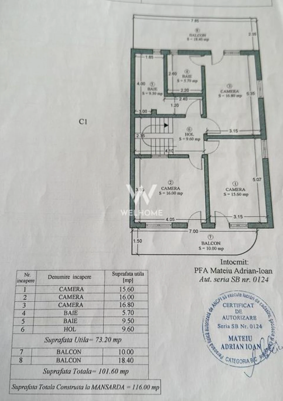 Etaj: 3 dormitoare (unul cu baie proprie), hol, baie, balcon