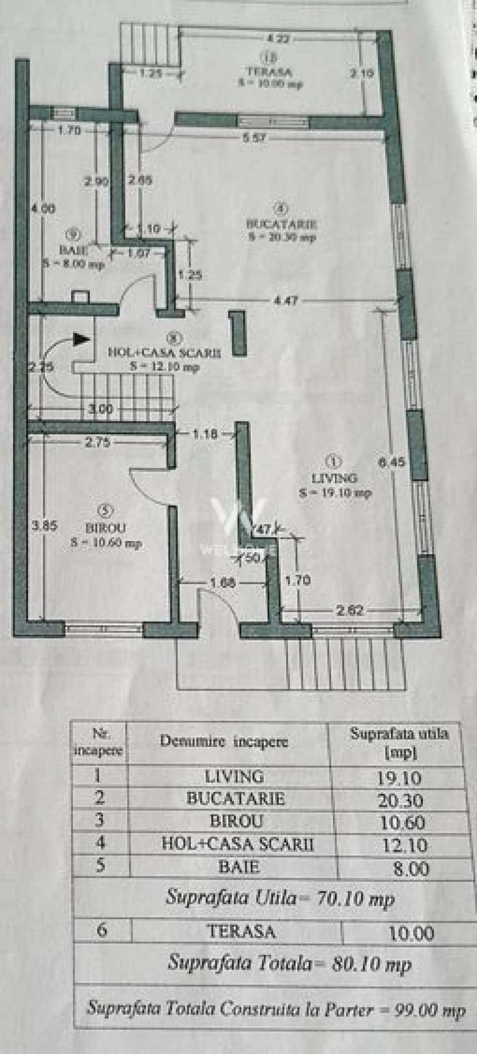 Parter: Living cu bucatarie, cu iesire pe terasa de 20mp , baie cu geam, hol si birou