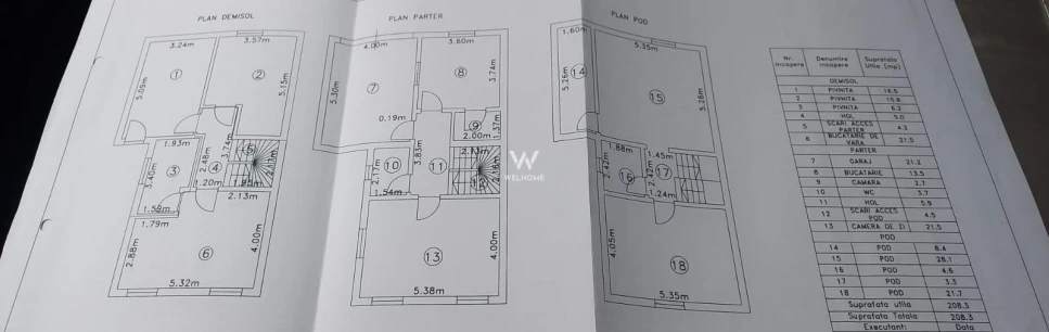 Compartimentare; 3 dormitoare, living, bucatarie, debara, pivnita, 2 bai, camera tehnica, distribuite astfel : demisol, parter si etaj.