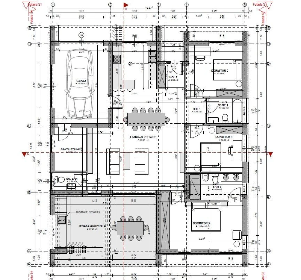 Compartimentare: Living spațios, bucătărie, 3 dormitoare, 3 băi, spațiu tehnic si terasă generoasă acoperită.