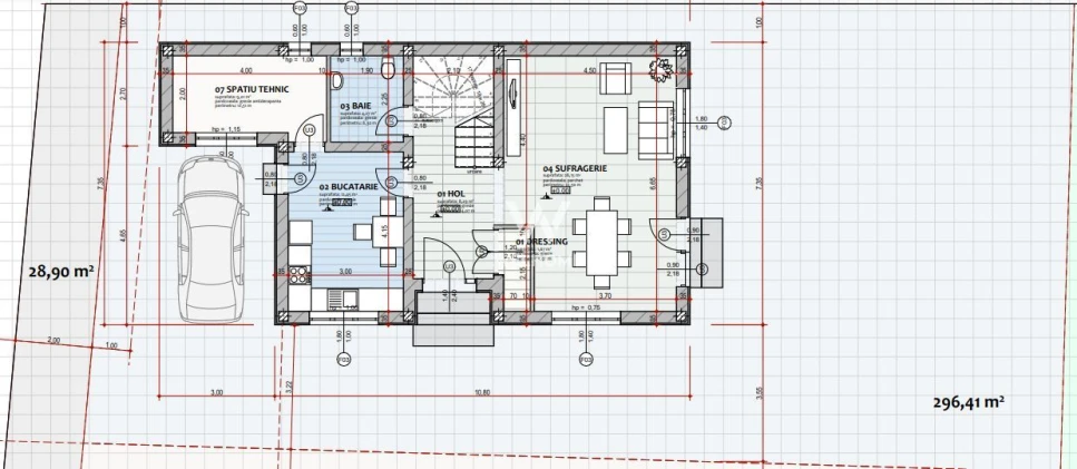 Parter: hol, living generos cu acces pe terasa, bucatarie inchisa, camera tehnica si baie