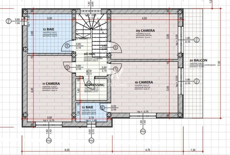 Etaj: 3 dormitoare, dintre care unul cu baie proprie, o baie pe hol si un dressing