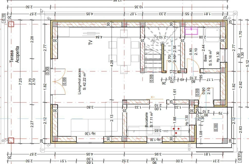 -Parter: Hol de acces, bucatarie separata, o baie m living+zona de luat masa cu iesire in terasa,