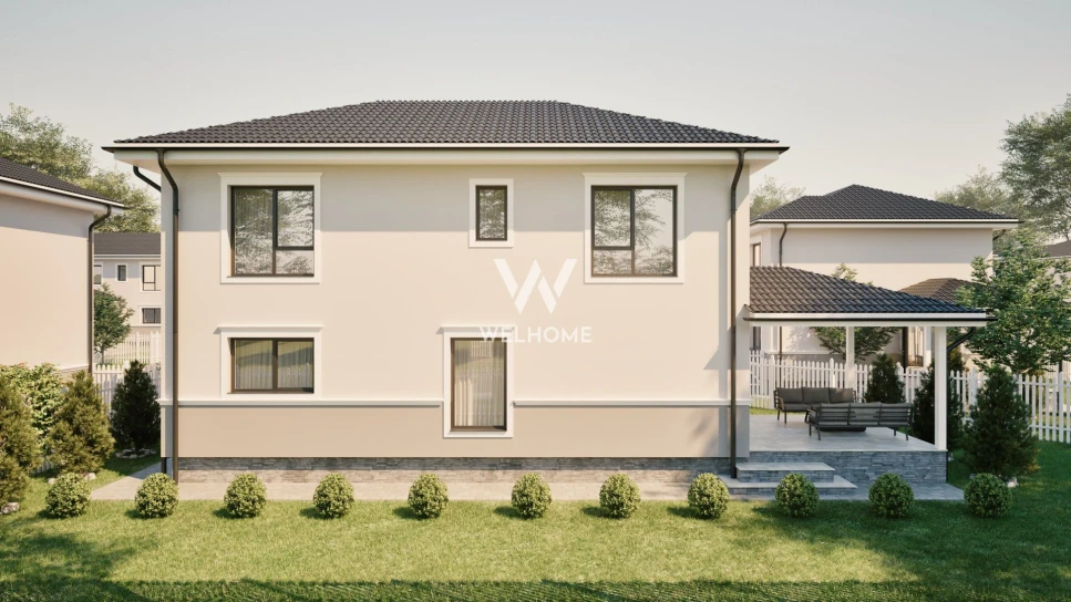 - Casa se preda LA CHEIE la EXTERIOR: Fațade cu tencuială decorativă, tâmplărie din PVC cu 3 foi de sticlă și profil de 5 camere, glafuri la geamuri, pe exterior, contoare de utilități montate la limita de proprietate (apometru, electric, gaz), gard alb în stil american, cu poartă de acces pietonală, 2 locuri de parcare pavate cu dale din beton - în fața casei, alei și trotuare amenajate în jurul fiecărei locuințe.