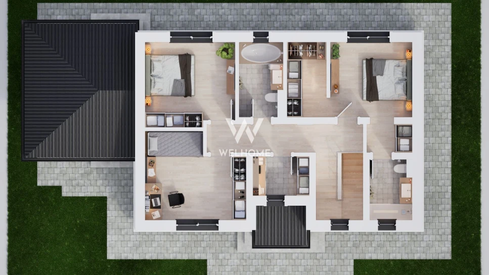 - La etaj: 3 dormitoare, unul cu baie proprie si dressing, baie, dressing.