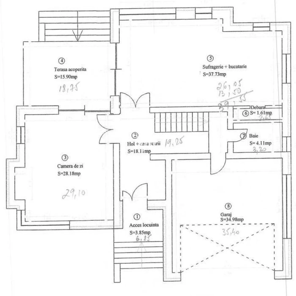 Parter: - Living cu bucatarie tip open space, camara, camera de zi, baie, hol