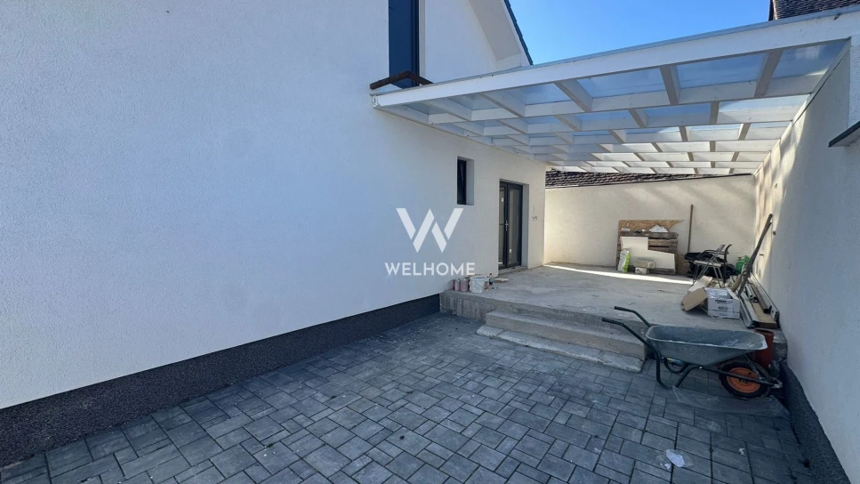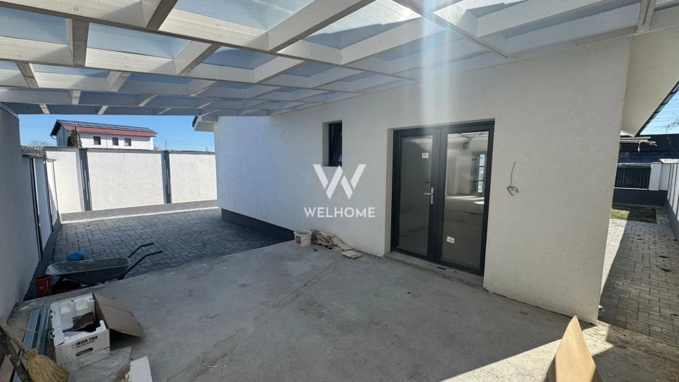 Casa se preda LA CHEIE exterior - gard inalt zidit, poarta cu automatizare, curte pavata, soclu, zone verde, izolata termic, tencuiala decorativa.