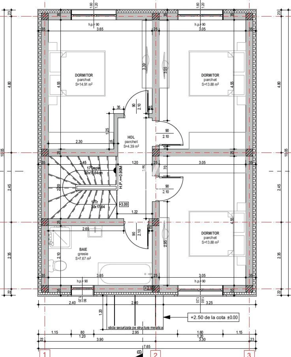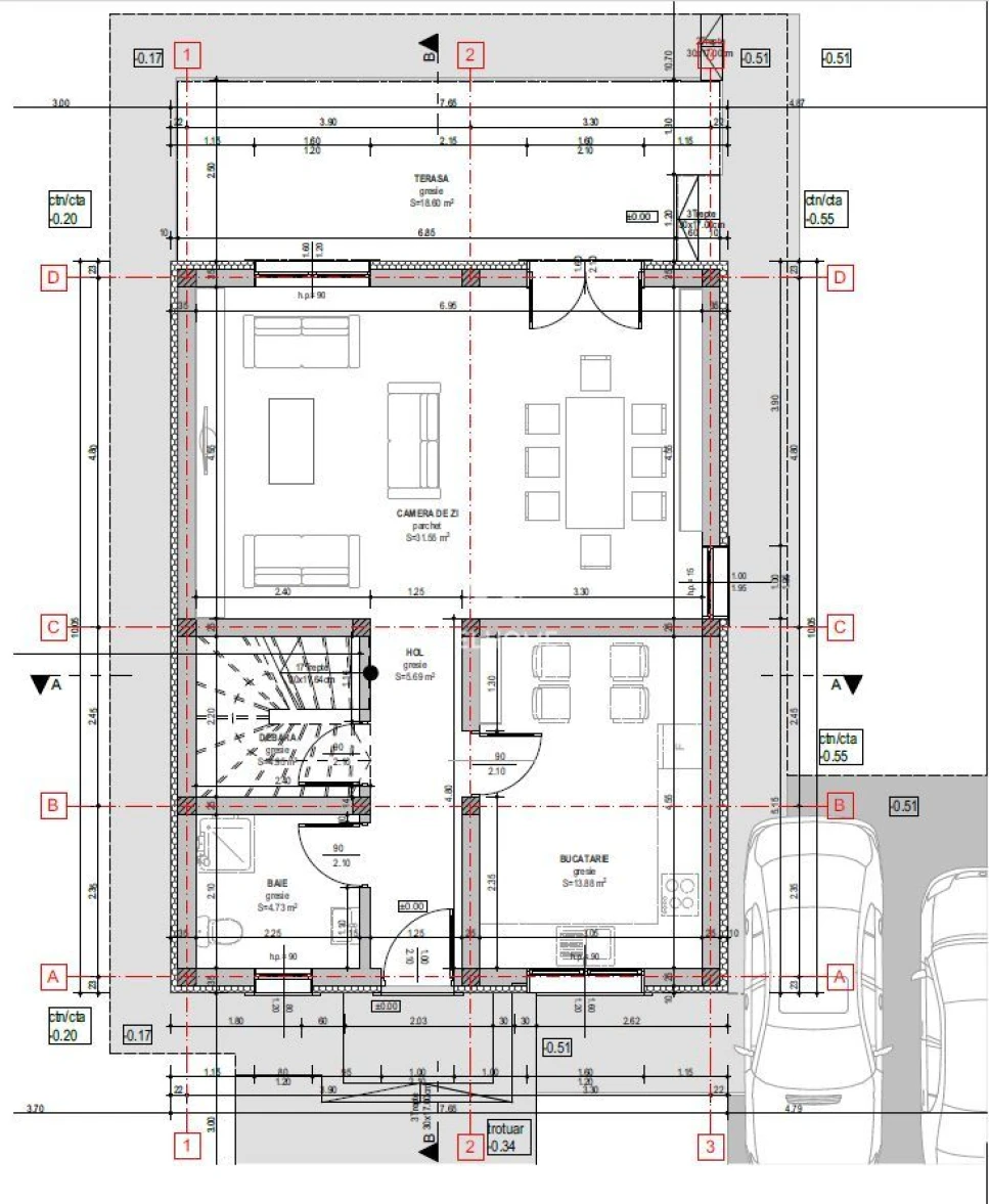 Constructie din beton si caramida Porotherm, sarpanta din lemn si invelitoare din tigla Bramac, izolatie din polistiren de 10 cm grosime cu densitate 80.