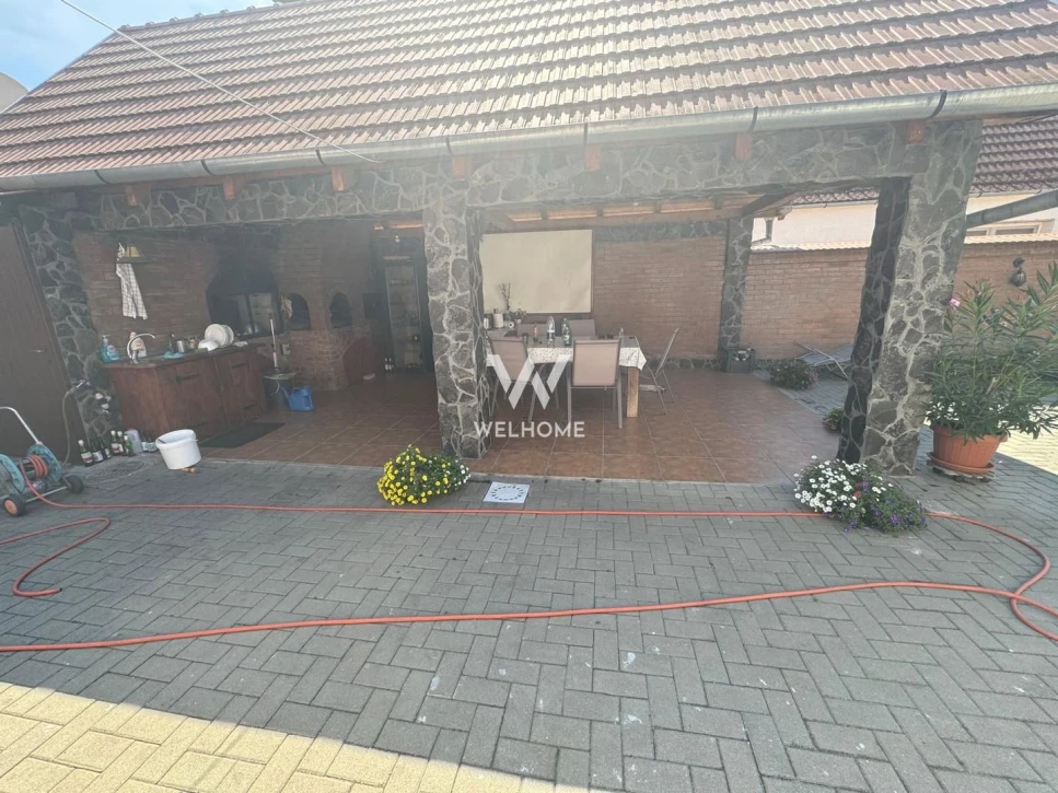 Curtea este amenajata cu alee pavata, un foisor complet dotat cu zona de barbeque si locuri de parcare .