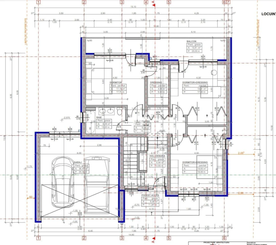 Etaj: hol, 3 dormitoare, baie cu geam, dressing