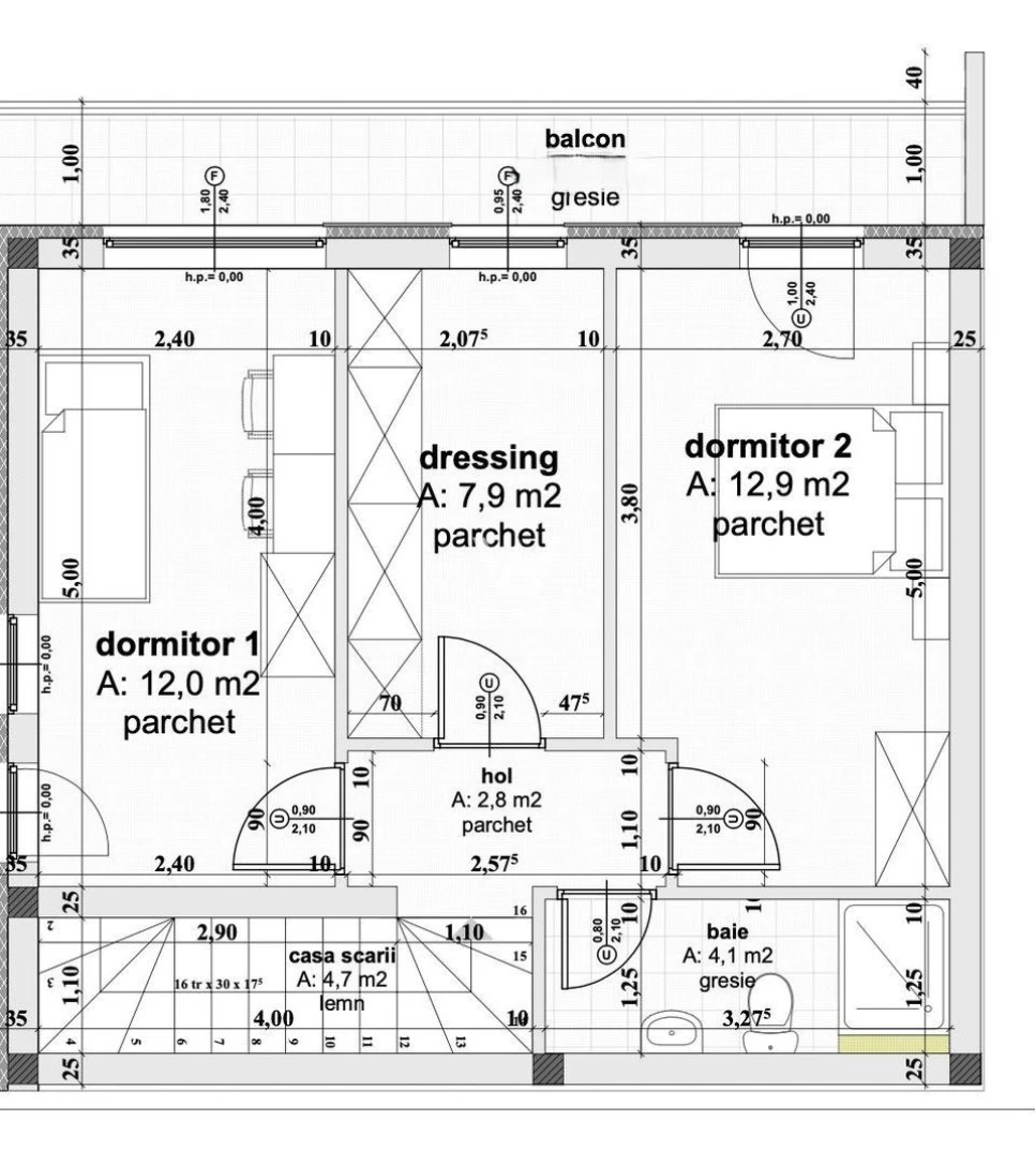 Etaj: 3 camere - cea mica poate fi dressing/birou, hol, baie, balcon 7 mp