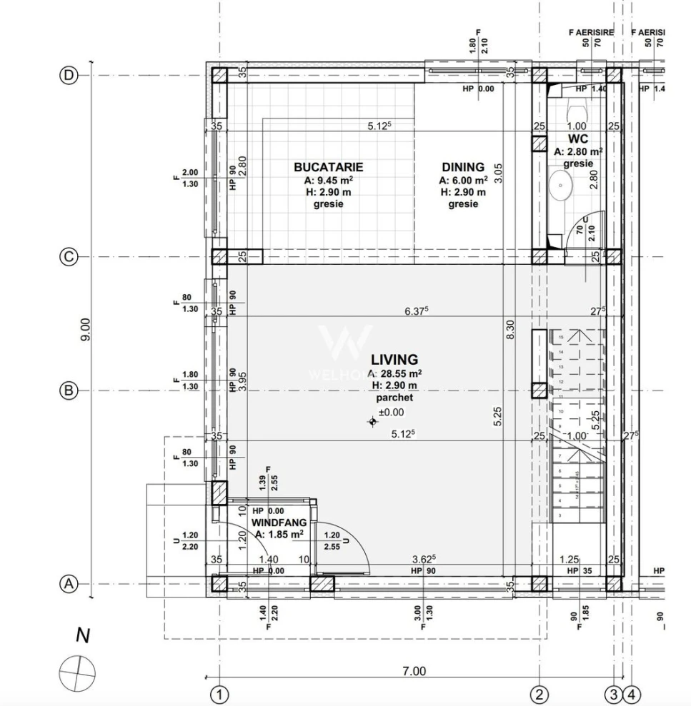 Parter: living spatios, bucatarie cu zona de luat masa, baie, camara/spatiul tehnic sub scari