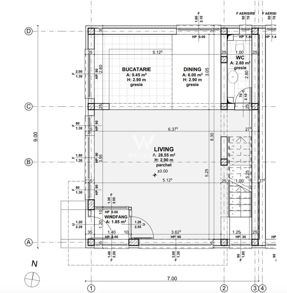 Parter: Hol, Living spatios, bucatarie cu zona de luat masa, baie