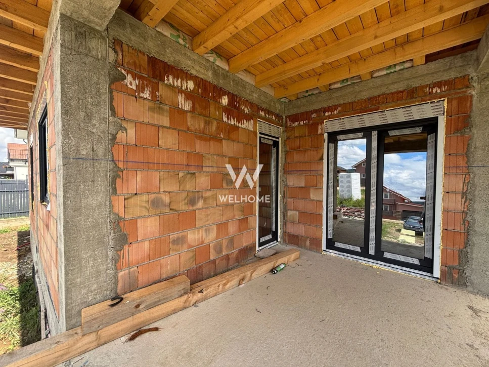 Casa se preda la stadiul de ALB in interior, pereti finisati pana la stadiul de lavabila, geamuri mari vitrate cu tripane si sapa elicopterizata pregatita pentru a pune finisajele.