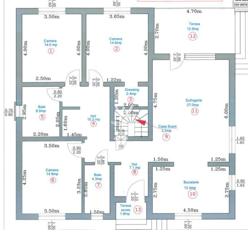 Hol mare cu loc de dulapuri,baie de serviciu cu cabina de dus si geam de aerisire,living de aprox 40mp cu acces pe terasa, bucatarie, 3 dormitoare , unul cu dressing mare si inca o baie cu geam de aierisire