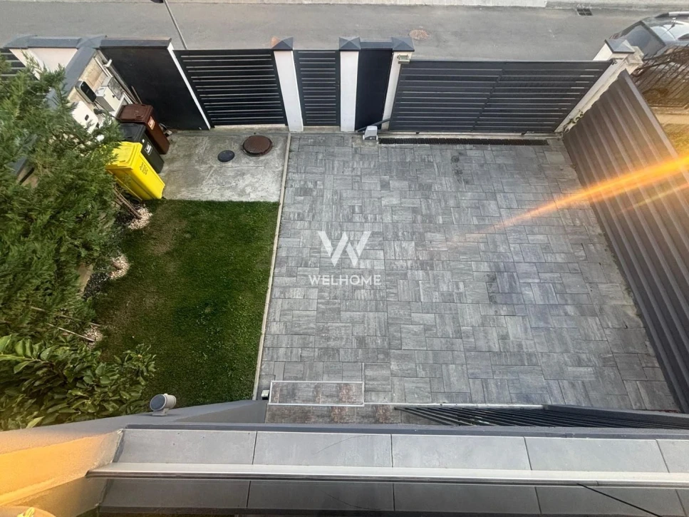 Terenul locuintei este distribuit in 2, in partea din fata pentru accesul auto si pietonal, iar in partea din spate pentru zona de grill si relaxare.