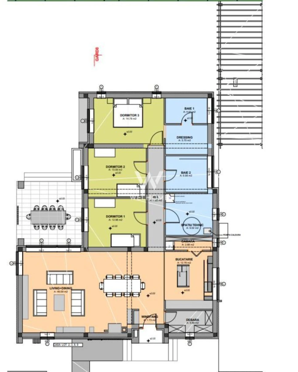- Compartimentare inteligentă: 3 dormitoare (12,98 mp, 13,09mp si 14, 78 mp) dintre care unul cu dressing 5,70 mp si baie 4,93 mp separat, living cu zona de dining 49 mp, o baie de 6.98 mp, camera tehnica 9 mp, debara 4,69 mp, bucatarie 12,78 mp la care avem si o camara de 2,88 mp. Separat de acest spatiu, locuinta dispune de carport amenajat pentru doua autoturisme si de o terasa acoperita.
