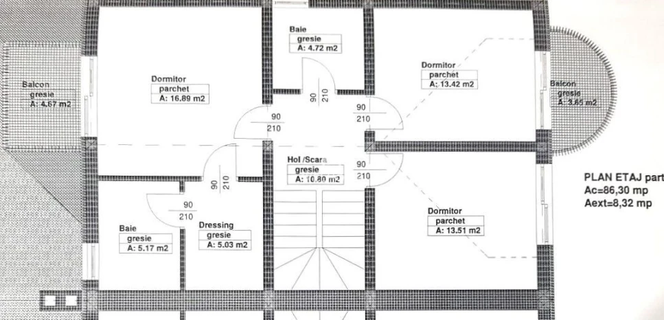 -Etaj: 2 dormitoare secundare cu acces la balcon, hol, baie si dormitor matrimonial cu dressing, baie si balcon