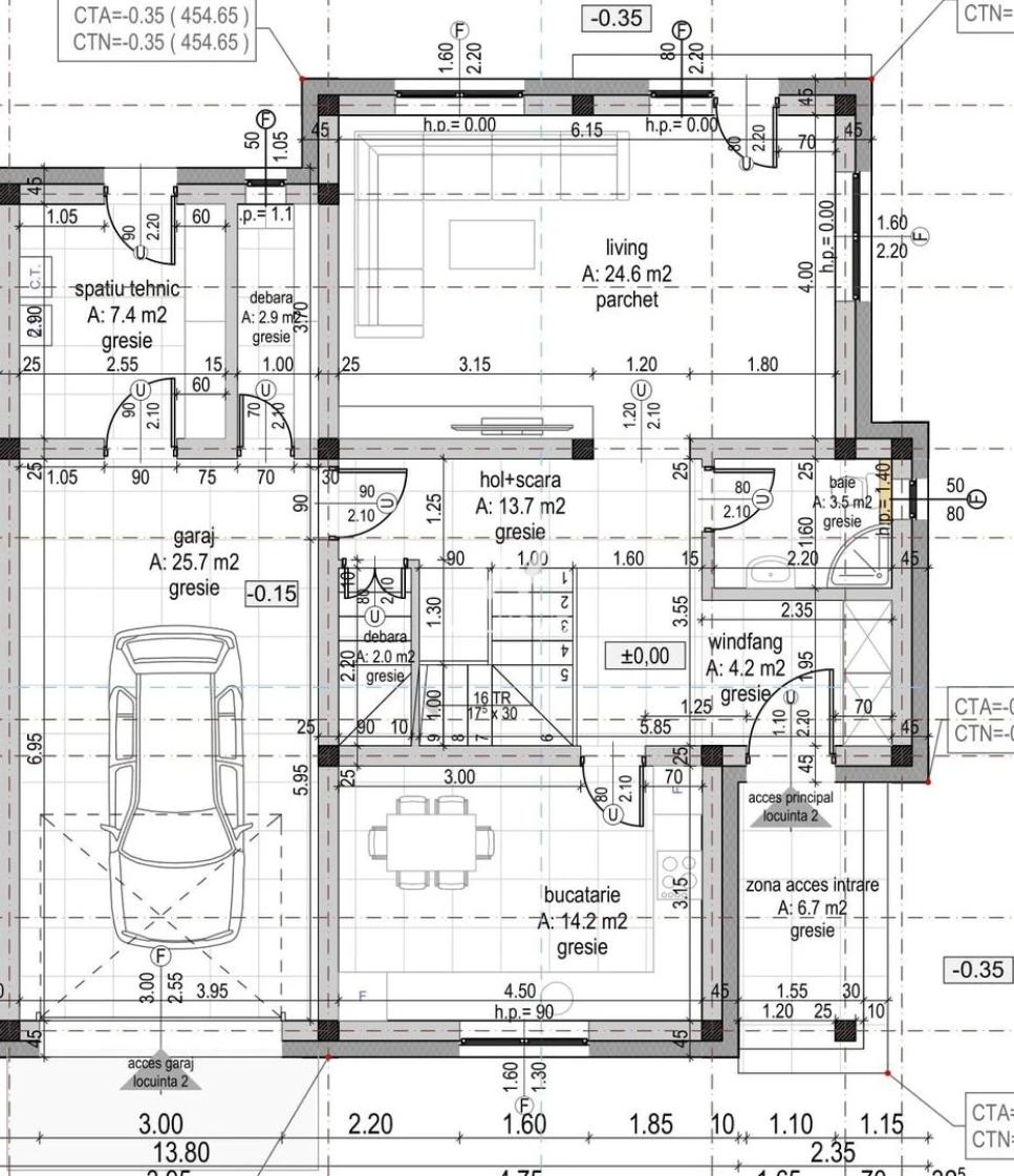 La intrare o terasa acoperita, hol larg, living, bucatarie, baie, debara. Garaj, camera tehnica si debara/depozit