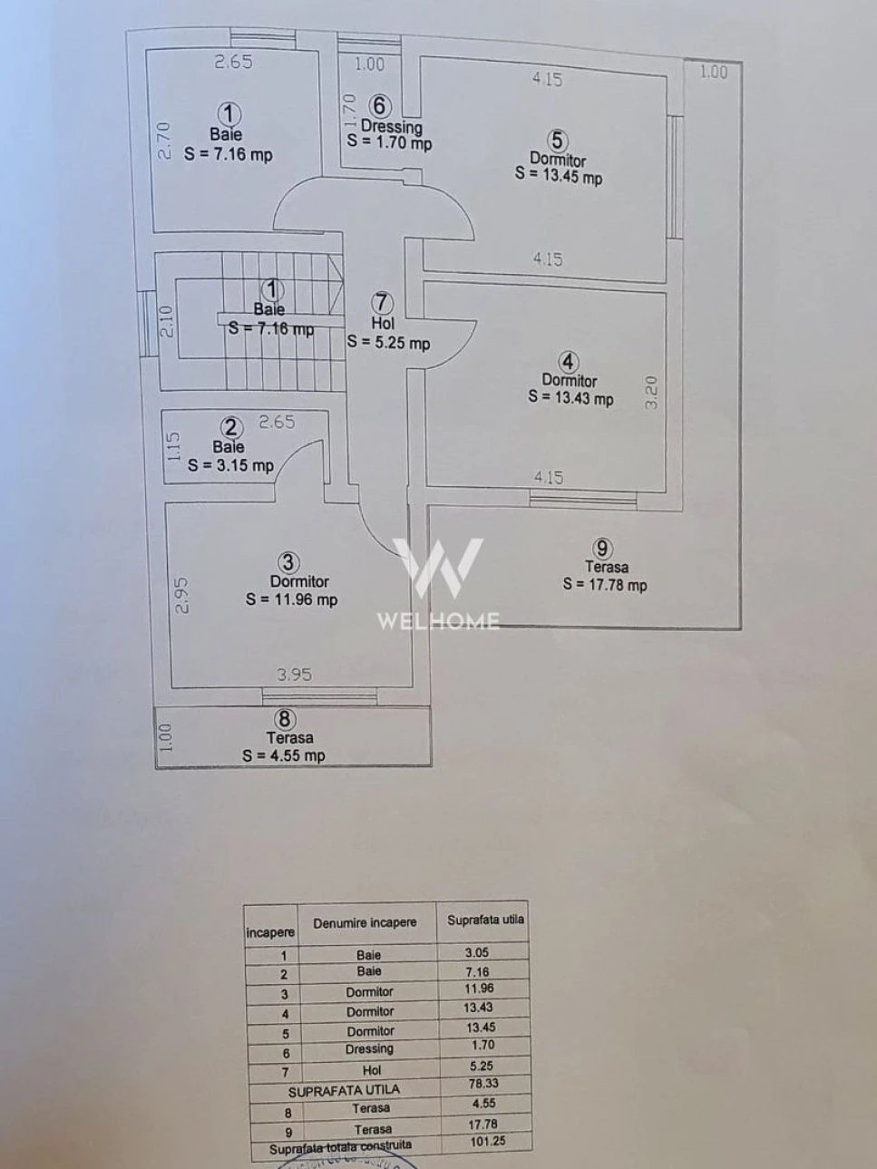 Etaj - 3 dormitoare fiecare cu acces la balcoane, hol, o baie mare cu cada jaquzzi - 2 dintre dormitoare au dressing