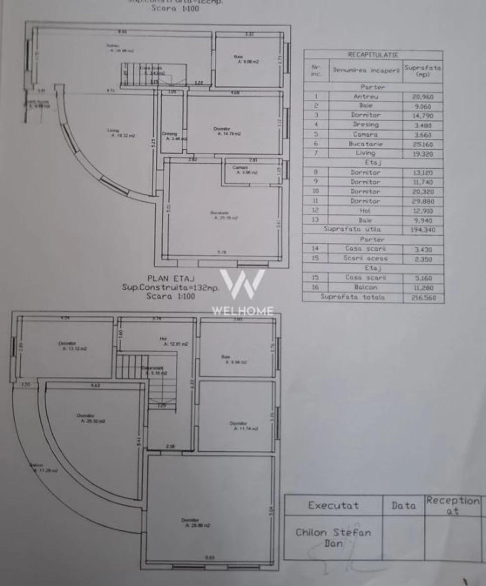 Suprafata utila a casei este de 195 mp + terasa 20 mp + pivnita 20 mp + 2 balcoane