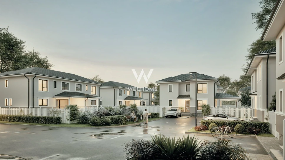 - Casa se preda LA CHEIE la EXTERIOR: Fațade cu tencuială decorativă, tâmplărie din PVC cu 3 foi de sticlă și profil de 5 camere, glafuri la geamuri, pe exterior, contoare de utilități montate la limita de proprietate (apometru, electric, gaz), gard alb în stil american, cu poartă de acces pietonală, 2 locuri de parcare pavate cu dale din beton - în fața casei, alei și trotuare amenajate în jurul fiecărei locuințe.
