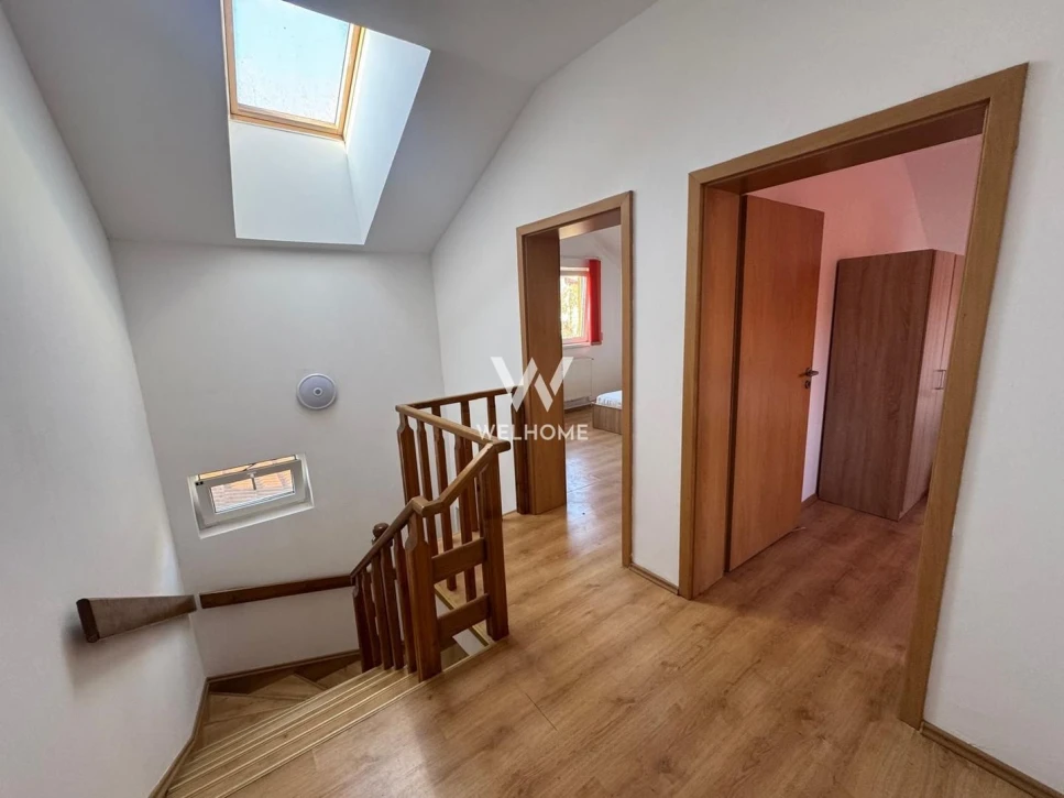 Etaj: hol, doua dormitoare, ambele cu iesire pe cate un balcon si o baie cu geam