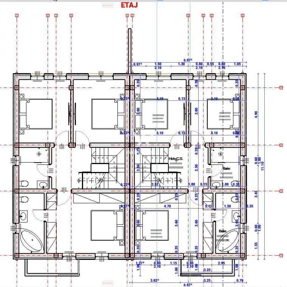 - La etaj: un dormitor matrimonial cu baie proprie si balcon, inca doua dormitoare cu baie comuna;